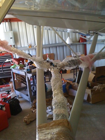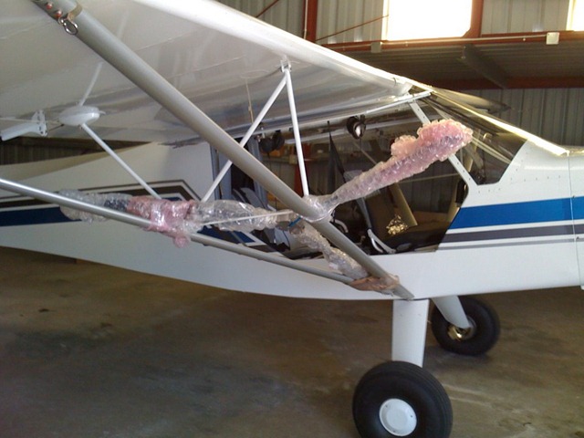 This morning he flew down with the prop taped to his wing struts. Now if I can just get someone to fly down with an engine taped to their wing struts I can finish this bird off!