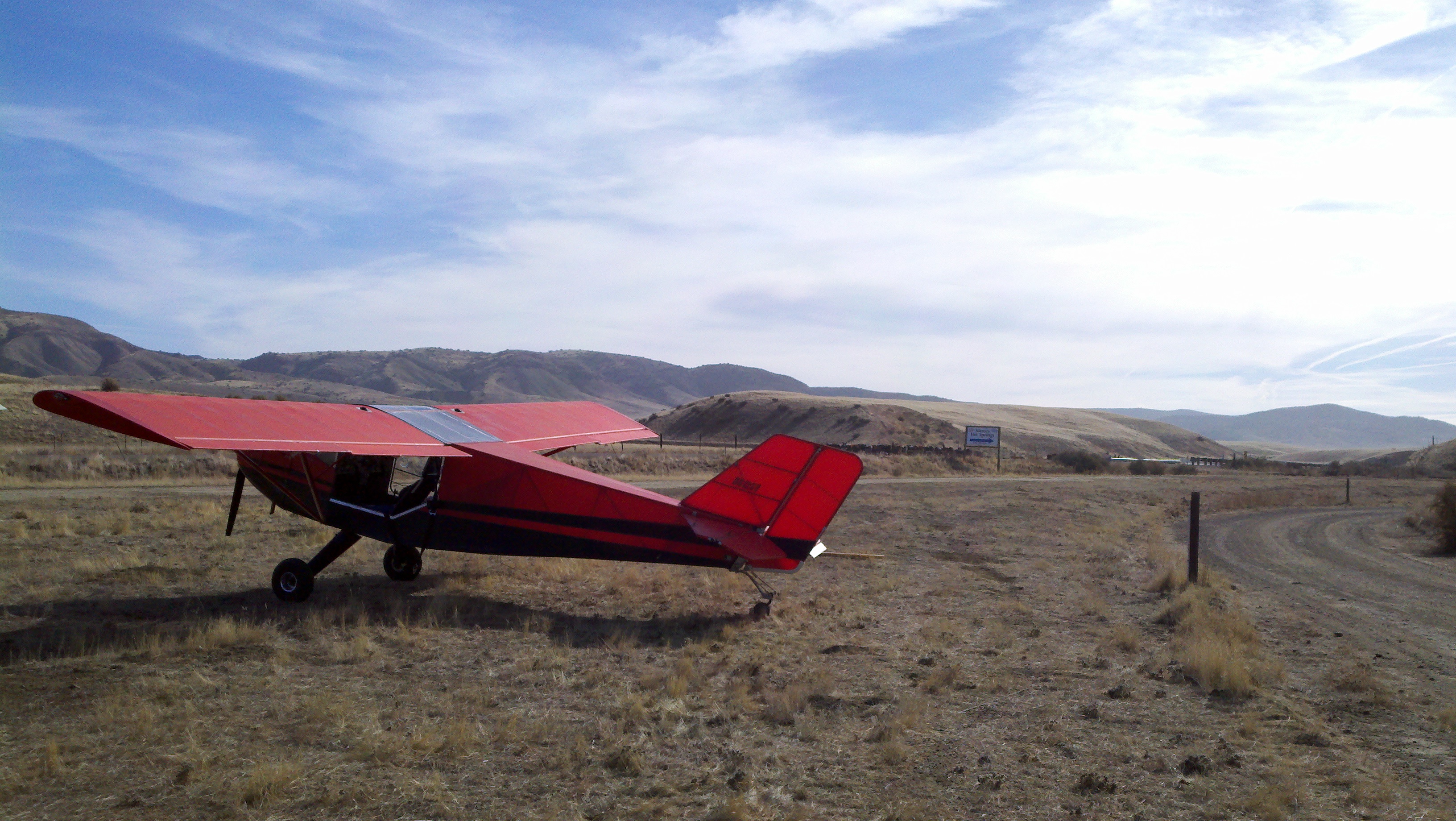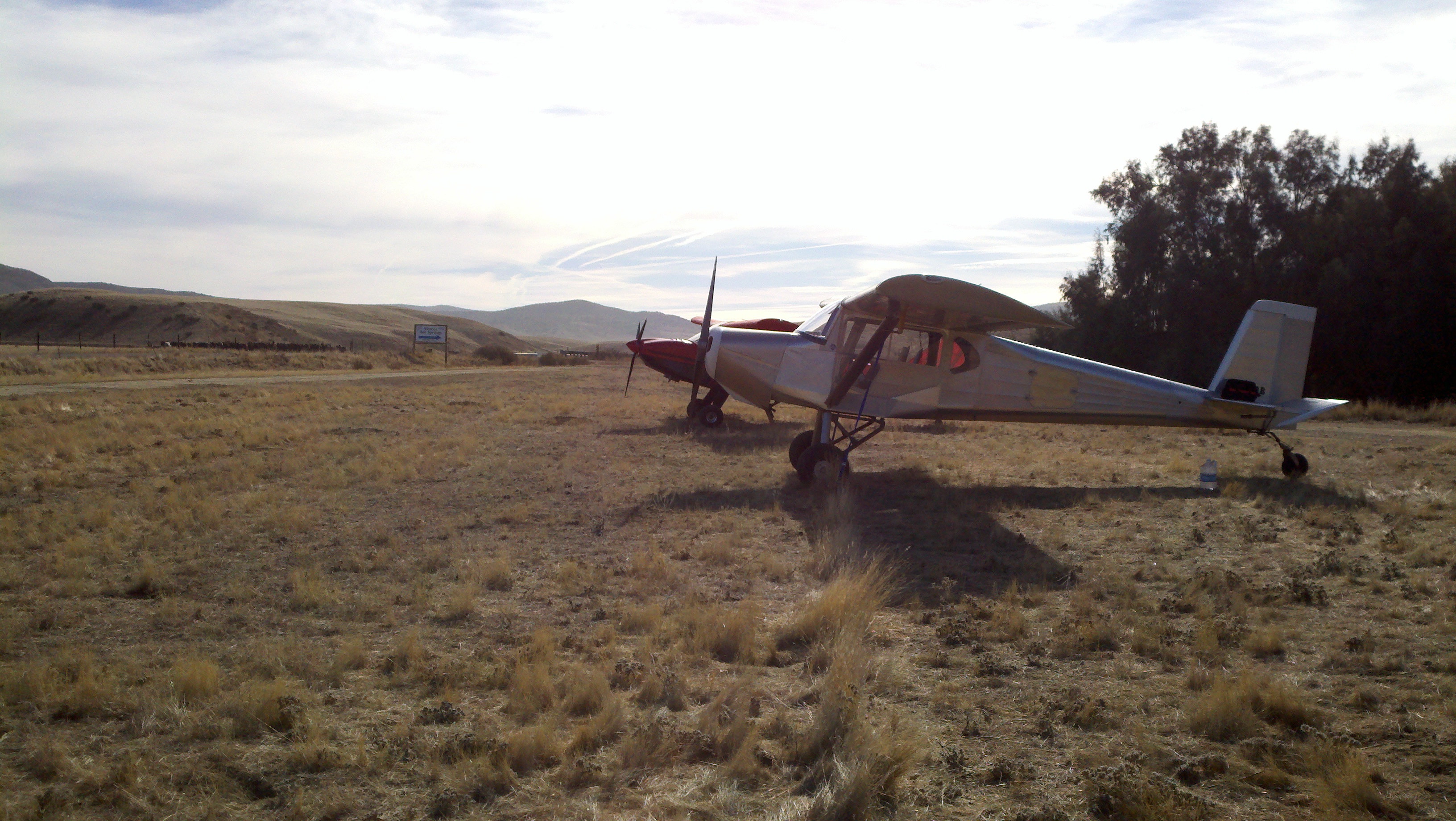 Today was perfect flying weather, a little hazy but not a breeze in the sky. MHS is located in a draw between some hills. The runway looks to be 2000 feet long or so and hard packed dirt so small tire guys can easily handle this runway. It IS narrow though so make sure you can land straight, you’ve only got a few feet either side of your tires to play with. Also, note that there are quite a few gopher holes in the parking area so if you do have small tires, be careful. My 6.00×6’s were fine.