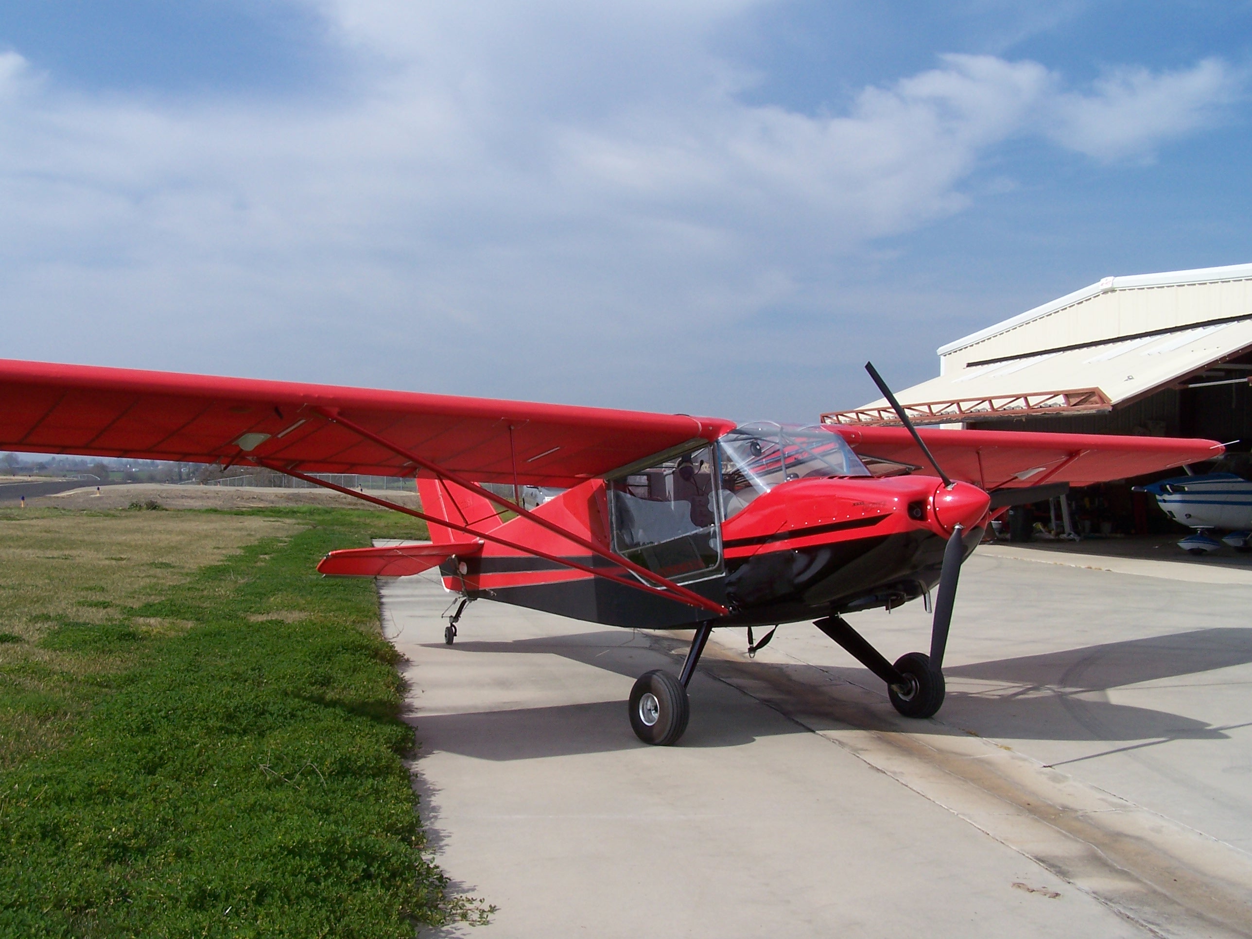 After a few photos I climbed in and belted up. Ran through the prestart checklist and fired her up. She sounded good so I taxied down to the runup area. Runup seemed normal. I say “seemed” because I’ve only flown behind a Rotax motor a couple of times. After a short quick prayer I announced on the radio and taxied out on the the runway. I started advancing the throttle slowly to get a feel for directional control and the rudder inputs that would be needed. The tail came up and I made a few rudder corrections to straighten her out and then pushed the throttle in all the way. Only problem is I was too slow because I was already airborne.